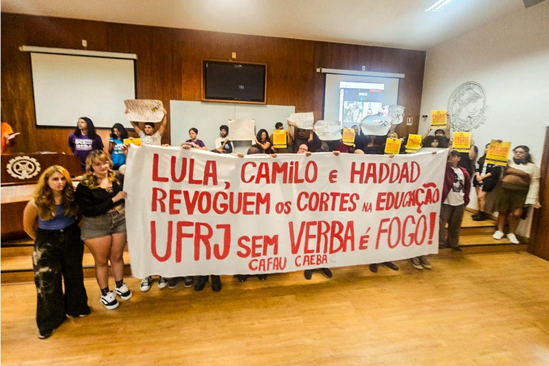 O orçamento insuficiente, é claro, dominou a primeira parte do Consuni. Estudantes de diferentes cursos realizaram uma manifestação diante dos conselheiros exigindo mais verbas para infraestrutura e assistência estudantil. “Estamos diante de um iminente apagão de toda a rede federal de ensino e especialmente os alunos mais vulneráveis serão os mais afetados”, destacou a representante estudantil Arthura Annastásiya. “Precisamos não só de recomposição, mas de aumento efetivo do nosso orçamento. Não podemos deixar o governo que a gente elegeu ceder à pressão do mercado e do Congresso”.