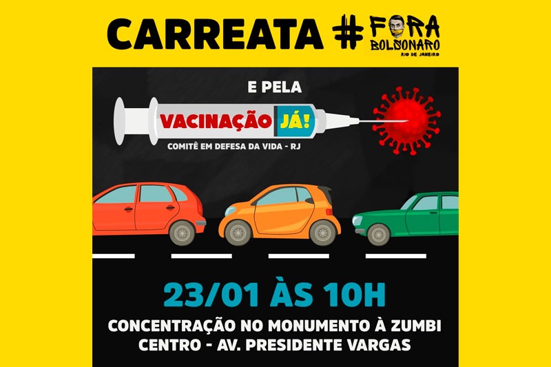 A AdUFRJ se soma aos esforços de movimentos sociais e sindicais em defesa da vacinação imediata, gratuita e universal. O sindicato participa com apoio logístico e financeiro da organização de uma carreata pelo impeachment do presidente Jair Bolsonaro, que com sua política negacionista na área da Saúde já provocou a morte de mais de 210 mil brasileiros, e para pressionar pela vacinação de toda a população. O ato acontece no próximo sábado, dia 23. A concentração será em frente ao Monumento de Zumbi, na Praça 11. A atividade é assinada pelo Comitê em Defesa da Vida do Rio de Janeiro.