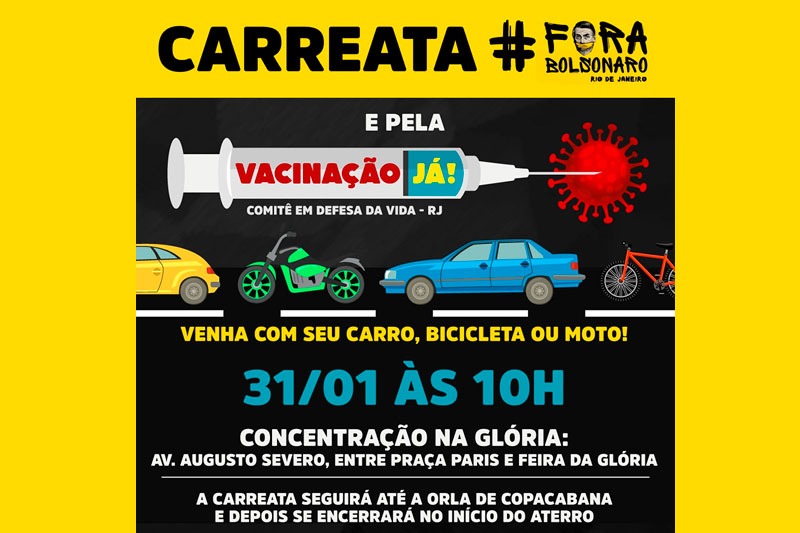 No dia 31, às 10h, outra carreata organizada pelo Comitê em Defesa da Vida do Rio de Janeiro vai cruzar a Zona Sul da cidade. A concentração será na Glória. A manifestação vai percorrer a orla de Copacabana e terminar no Aterro do Flamengo. Desta vez, além de defender vacina para todos e exigir o impeachment, a manifestação também engloba pautas como o retorno do auxílio emergencial, a defesa dos empregos e a crítica à privatização da Cedae.