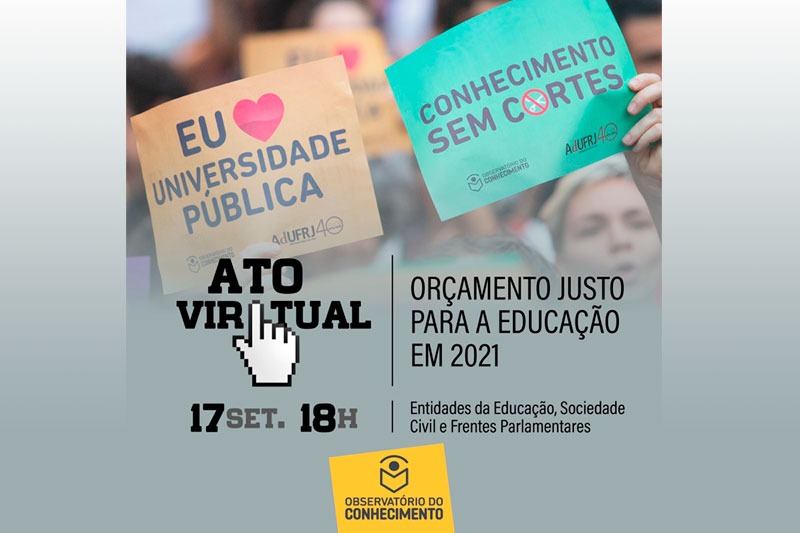 O Observatório do Conhecimento, rede formada por diversas associações docentes — entre elas, a AdUFRJ —, iniciou uma campanha por um orçamento justo para a Educação em 2021. No dia 17, às 18h, o Observatório organiza um ato virtual com representantes da sociedade civil, de entidades educacionais e de frentes parlamentares.