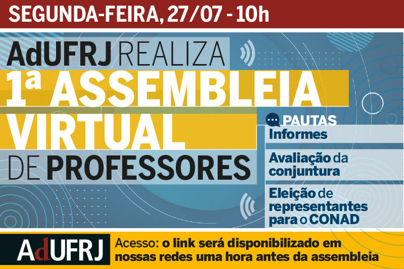 A diretoria convoca Assembleia Geral virtual da AdUFRJ-SSind para o dia 27 de julho de 2020 (segunda-feira), de 10h às 12h30, que será realizada virtualmente através da plataforma Zoom.