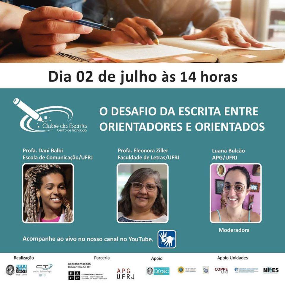 O Clube da Escrita transmite, nesta quinta-feira (2), uma conversa sobre “O desafio da escrita entre orientadores e orientados” com a participação de Dani Balbi, Doutora em Ciências da Literatura pela Faculdade de Letras e docente da Escola de Comunicação da UFRJ (ECO); e Eleonora Ziller, Doutora em Literatura Comparada, docente da Faculdade de Letras da UFRJ e presidente da AdUFRJ.
