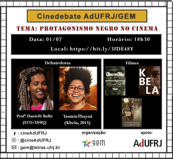 O CineAdUFRJ desta semana vai discutir o Protagonismo Negro no Cinema. Orientando o debate, teremos a Professora Danielli Balbi (Escola de Comunicação- UFRJ), doutora em Ciência e Literatura pela UFRJ e a cineasta e diretora Yasmin Thayná (Kbela, 2015).