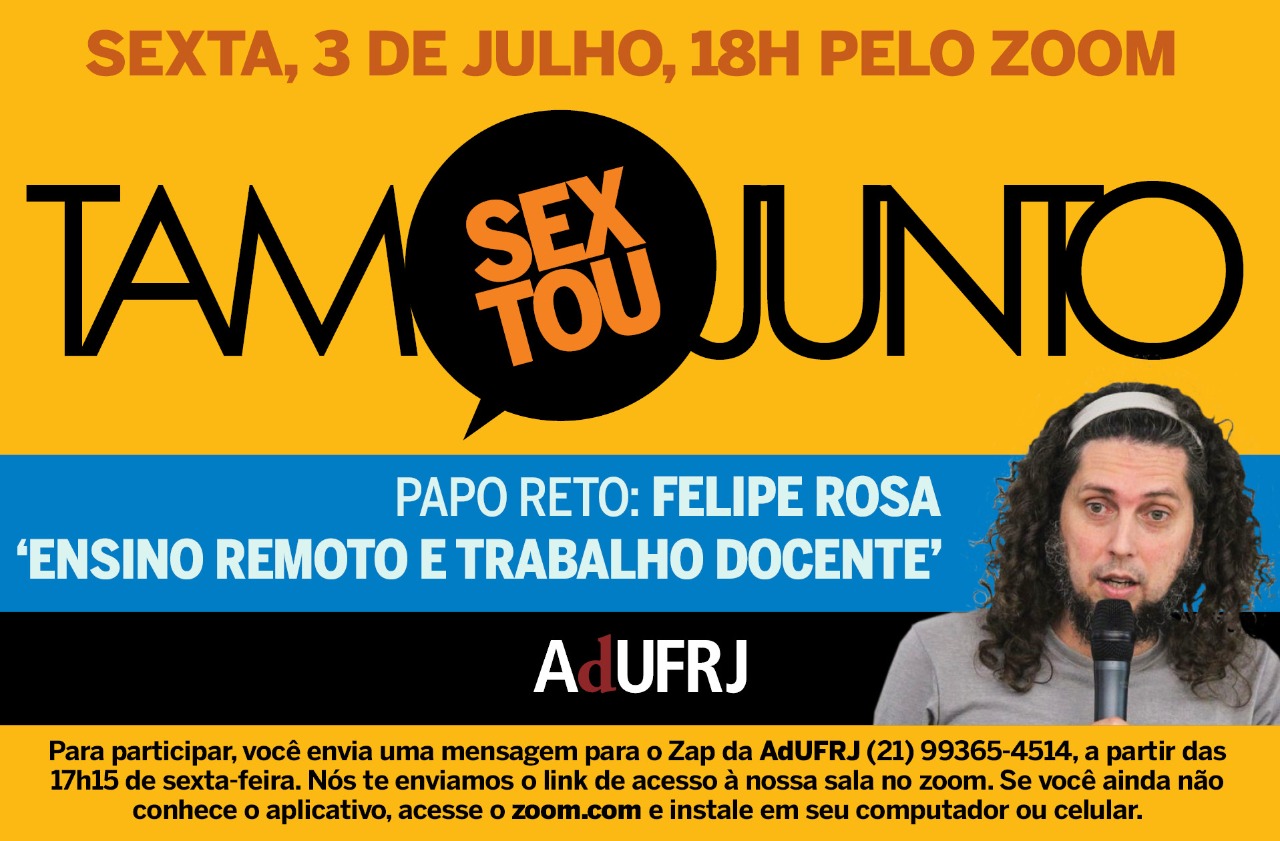 Diretor da AdUFRJ e professor do Instituto de Física, Felipe Rosa vai puxar a conversa do Tamo Junto, um encontro virtual organizado pela associação docente todas as sextas-feiras. Desta vez, o tema será "ensino remoto e trabalho docente". Para participar, é fácil: a partir das 17h15 você envia uma mensagem para o whatsapp da AdUFRJ (21) 99365-4514 e nós te enviamos o link de acesso à nossa sala no ZOOM. Se você ainda não conhece o aplicativo, acesse zoom.com e instale em seu computador ou celular.