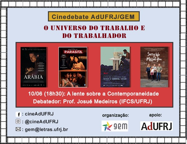 Nesta quarta-feira, 10, ocorre a segunda sessão do CineAdUFRJ A Lente sobre a Contemporaneidade sobre as novas configurações das relações de trabalho, como capitalismo de plataforma, uberização e o infoproletariado. A atividade é organizada pelo Grupo de Educação Multimída