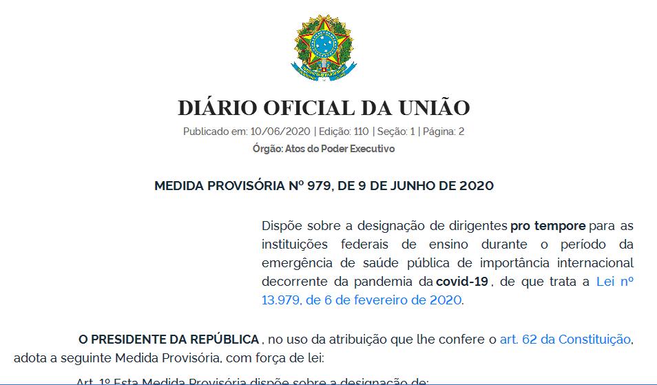 Mais um ataque do governo à autonomia das universidades. O Diário Oficial da União desta quarta-feira, 10, publica a Medida Provisória nº 979, que dispõe sobre a designação de dirigentes pro tempore nas instituições federais de ensino durante a pandemia.