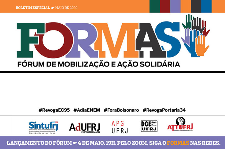 AdUFRJ, APG, ATTUFRJ, DCE e Sintufrj lançaram a segunda edição do boletim unificado do FORMAS. O destaque é a manifestação virtual de 15 de maio, comemorando um ano da maior manifestação contra o governo Bolsonaro. Leia AQUI.
