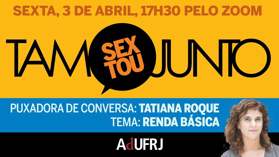 Hoje tem o bate-papo da AdUFRJ para as professoras e professores que querem arejar a cabeça e trocar ideias durante esse período de isolamento social. E quem vai puxar a conversa é a professora Tatiana Roque, vice-presidente da Rede Brasileira da Renda Básica, que atuou diretamente na campanha que levou à aprovação da lei da Renda Básica Emergencial.