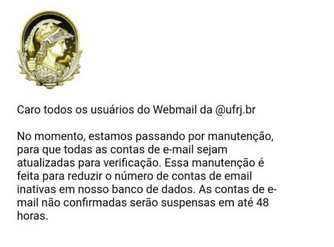 A Superintendência de Tecnologia da Informação e Comunicação (SuperTIC/UFRJ), por meio de sua Diretoria de Segurança da Informação, identificou uma tentativa de fraude eletrônica via e-mail, utilizando o nome da Universidade. Na mensagem (ao lado), solicita-se que o usuário acesse um link para confirmar o e-mail cadastrado, sob pena de suspensão da conta. Esse tipo de golpe, chamado phishing, tem como objetivo a aquisição de informações dos usuários, como login e senhas, para uso criminoso.