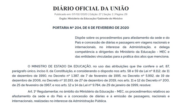 Diante da articulação da comunidade científica, o Ministério da Educação voltou atrás e revogou a portaria 2.227 de dezembro de 2019, que limitava a dois o número de professores e servidores em viagens para eventos fora da sua unidade. Publicada no último dia 06, a nova portaria do Ministério suprimiu o artigo que tratava especificamente do tema. Porém, mantém a obrigatória a comunicação oficial ao Ministério da Educação através do Sistema de Concessão de Diárias e Passagens, em viagens com ou sem ônus.