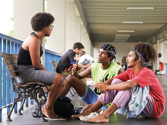COLETIVOS ajudam negros a ganharem espaço na universidade - Foto: Ernesto CarriçoDesde 2013, a implantação das cotas nas universidades federais fez a UFRJ avançar rumo à democratização do ensino superior. Apesar da conquista, o dia a dia acadêmico ainda é terreno árido para estudantes negros. São eles os mais dependentes de políticas de permanência como bolsas, moradia, transporte e alimentação. Os alunos também esbarram em violências subjetivas, como a falta de representatividade no corpo docente.