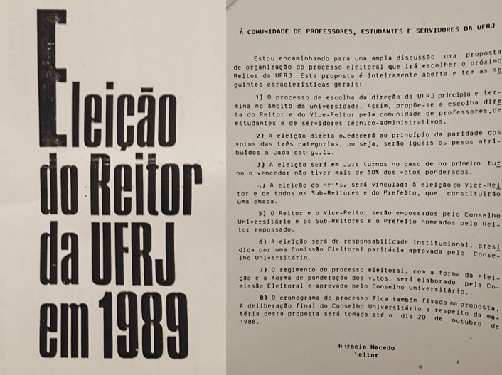 É importante fazer uma digressão temporal para compreender o contexto histórico no qual foi viabilizada a primeira eleição para reitor da UFRJ em 1985, com a vitória do professor Horário Macedo. A comunidade acadêmica estava com “fome e sede” de democracia.