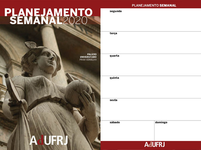 Os professores vão ganhar da AdUFRJ uma agenda para planejamento semanal. No brinde, além das páginas dedicadas à organização dos compromissos semanais no próximo ano, o conteúdo é ilustrado com imagens de obras de arte da instituição, encontradas ao ar livre ou pertencentes aos acervos dos museus. Foi uma forma de homenagear o centenário da universidade. No texto de abertura da publicação, a presidente da AdUFRJ, professora Eleonora Ziller, faz um convite à unidade,“Em 2020, a UFRJ celebra 100 anos de universidade pública, grauita e de qualidade. Recomeçaremos incansáveis, preenchendo cada semana com nossos planos e nossos sonhos. Esse é o nosso convite, que estejamos juntos nessa caminhada”. O material será distribuído nas atividades do sindicato e também pode ser obtido na sede da AdUFRJ.