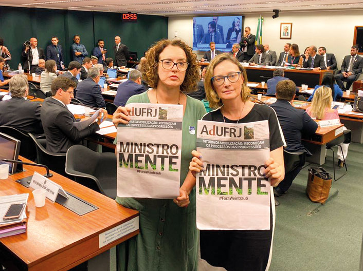Não foi só na reunião que a gestão Weintraub foi fortemente criticada. A atuação do ministro foi alvo de relatório produzido pela Comissão Externa de Acompanhamento do MEC, concluído na semana passada. O documento, destrinchado na última edição do Jornal da AdUFRJ, concluiu que a gestão está “muito aquém do esperado”. Foram apontados falta de planejamento estratégico, ausência de planos de trabalho, linhas de atuação pouco claras, cortes acentuados de investimentos nas diversas áreas. O relatório foi aprovado por unanimidade, com acréscimos de recomendações para o ensino técnico, no dia 10.