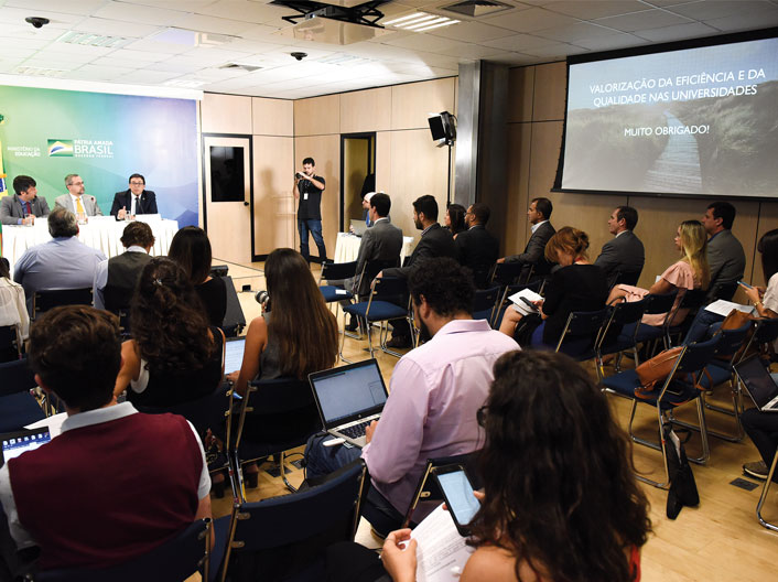 Anúncio do programa em coletiva de imprensa - Foto: Luis Fortes/MECMuito barulho em troca de muito pouco. Na sexta-feira (29), o MEC chamou a imprensa para anunciar um pomposo projeto de “valorização da eficiência e da qualidade nas universidades”. O objetivo é liberar R$ 125 milhões, ainda em 2019, para obras em andamento e em energia limpa nos campi. Um número baixo, considerando todas as universidades federais. Maior do país, a UFRJ vai receber apenas R$ 1,572 milhão.