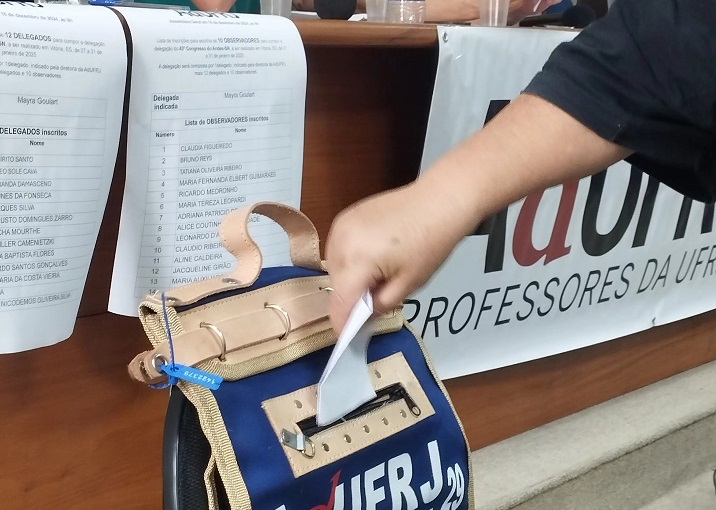 A assembleia da AdUFRJ definiu na tarde de segunda-feira, 16, a delegação que representará os professores da UFRJ no 43º Congresso do Andes. A votação foi presencial e realizada em urna. Foram eleitos 12 delegados e 11 observadores. Presidenta da AdUFRJ, a professora Mayra Goulart é a delegada indicada da diretoria e por isso não foi votada na assembleia. O próximo congresso do Sindicato Nacional será realizado na cidade de Vitória (ES), de 27 a 31 de janeiro. Veja abaixo quem são os delegados e os observadores.