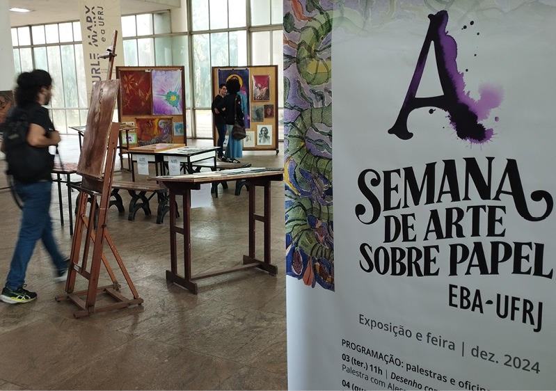 A entrada do edifício Jorge Machado Moreira virou uma enorme galeria de arte entre 3 e 5 de dezembro. Arte à moda antiga, com obras feitas pelos alunos no velho e bom papel em aquarelas, guaches, têmperas, colagens, desenhos e sketchbooks. Todos expostos na 1ª Semana de Arte Sobre o Papel da Escola de Belas Artes.