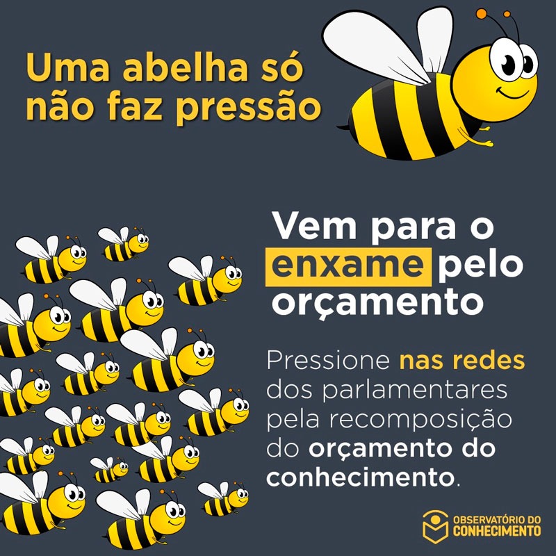 O Observatório do Conhecimento, rede nacional de sindicatos de docentes com forte atuação da AdUFRJ, lançou a campanha Uma Abelha Só Não Faz Pressão. A ideia do movimento é criar um enxame de mensagens para pressionar os parlamentares e reverter os cortes no orçamento das universidades. A proposta de lei orçamentária deve ser votada no próximo dia 24 de março. A cada dia, entre 15 e 19 de março, o Observatório indicará três parlamentares para fazer pressão, além da presidente da Comissão de Orçamento, o relator geral e os relatores setoriais de Educação e da Ciência e Tecnologia. Para participar, você escreve uma mensagem cobrando a recomposição do orçamento nas postagens mais recentes das redes sociais desses parlamentares. Neste link estão disponíveis a lista dos parlamentares, suas redes sociais e uma sugestão de mensagem: http://bit.ly/enxamepelaploa2021