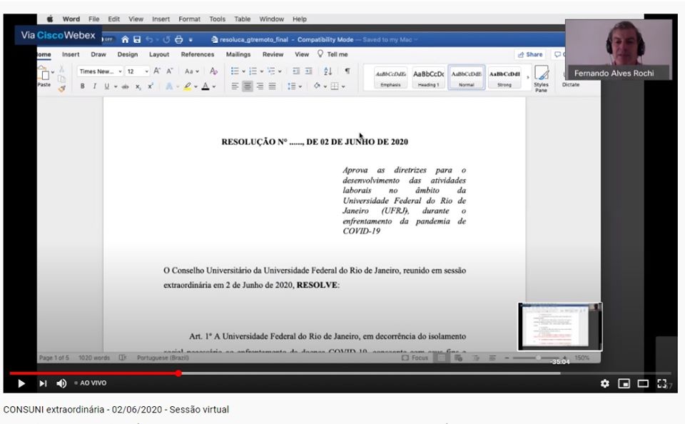 O Conselho Universitário aprovou, no início da tarde de terça (2), a resolução sobre o trabalho dos servidores da UFRJ durante a pandemia. O documento teve 46 votos favoráveis e apenas um contrário.