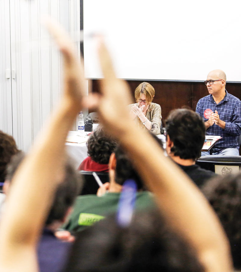 Em reunião realizada no dia 17, professores da UFRJ rejeitam candidato do PSL, apoiam Haddad e levam decisão para o Andes. Também aprovam a criação de uma frente antifascista Num sonoro não ao candidato que ameaça a democracia brasileira, professores da UFRJ decidiram recomendar ao Sindicato Nacional de Docentes o voto em Fernando Haddad (PT) e repudiar Jair Bolsonaro (PSL) na disputa presidencial. A decisão foi tomada na tarde de quarta-feira, 17, numa assembleia marcada por profunda preocupação com o destino do país e da universidade. “A neutralidade, hoje, é Bolsonaro. O muro é Bolsonaro”, afirmou a presidente da Adufrj, Maria Lúcia Werneck Vianna. Os docentes resolveram submeter o resultado da assembleia à reunião do Andes em Brasília, no dia 18, e montaram um calendário de mobilizações no Rio de Janeiro. Uma das atividades será a assembleia comunitária da UFRJ, na segunda-feira, dia 22, às 14h, no auditório do bloco A do Centro de Tecnologia. “Rejeitar a candidatura de Bolsonaro é insuficiente. É preciso afirmar voto no 13”, sinalizou Sara Granemann, representante dos docentes do Serviço Social. “Somos bastante críticos ao PT, mas o movimento é em defesa da democracia e contra o fascismo”, completou. Professores de diferentes grupos políticos apontaram, de forma unânime, a necessidade de se posicionar. “Há uma ameaça muito grave às universidades”, alertou o vice-presidente da Adufrj, Eduardo Raupp. Luciana Boiteux, do Direito, pediu unidade: “Estão em risco a democracia e a universidade pública. A UFRJ tem a responsabilidade de ser um polo organizador e de mobilização”. Para a universidade, o momento é decisivo. Há um abismo entre as propostas de Haddad e Bolsonaro para o ensino superior, como mostraremos ao longo deste Boletim. Se Bolsonaro tem um programa privatista e que fere a autonomia universitária, Haddad propõe o fortalecimento do ensino público e o respeito à autonomia universitária. Decisão do Andes A posição da UFRJ coincidiu com a da maioria das assembleias de professores das universidades brasileiras, mas foi derrotada na reunião do Andes por 13 votos a 9. Outras 11 assembleias votaram pelo sim a Haddad, mas como não havia representantes deles na reunião de Brasília, seus votos foram desconsiderados. Venceu a posição da diretoria do sindicato nacional, expressa no lema “contra o voto branco, contra o voto nulo e contra o fascismo”. Outras deliberações da assembleia A assembleia também aprovou: a criação de uma frente antifascista; o engajamento da Adufrj no ato das mulheres, sábado, dia 20; e no Dia Nacional de Lutas em Defesa do Serviço Público, em 24 de outubro. Uma comissão foi formada para elaborar materiais que dialoguem com a população sobre como as políticas das áreas econômica e social do candidato do PSL atacam especialmente os serviços públicos e os direitos dos mais pobres. “Precisamos dialogar dentro da universidade, mas também fora”, defendeu Maria Paula Araújo, diretora da Adufrj. AS PROPOSTAS DE HADDAD PARA AS UNIVERSIDADES Privatização e orçamento - O programa de governo propõe a valorização do ensino público e do serviço público. - Defende revogar a Emenda Constitucional 95, que instituiu o Teto de Gastos. Tem como proposta aumentar investimentos até alcançar a meta 20 do PNE (Plano Nacional de Educação), que prevê 10% do PIB para o setor. - Propõe fortalecer universidades e institutos federais com financiamento permanente. Conteúdo curricular - Como contraponto ao Escola Sem Partido, o programa de Haddad propõe Escola com Ciência e Cultura, para transformar as unidades educacionais em espaços de paz, reflexão, investigação científica e ação cultural. - Defende ações de educação para as relações étnico-raciais e as políticas afirmativas, com valorização da diversidade e dos direitos humanos, “a partir de uma perspectiva não-sexista, não-racista e não-LGBTIfóbica”. Ciência e Tecnologia - Propõe recriar o Ministério de Ciência, Tecnologia e Inovação e ampliar os investimentos no setor. Formação de docentes - Propõe fortalecer o Pibid, voltado a estudantes de pedagogia e licenciatura; reforçar a Universidade Aberta do Brasil, além de retomar o projeto Universidade em Rede dos Professores, assegurando acesso dos concursados a vagas disponíveis na rede pública.