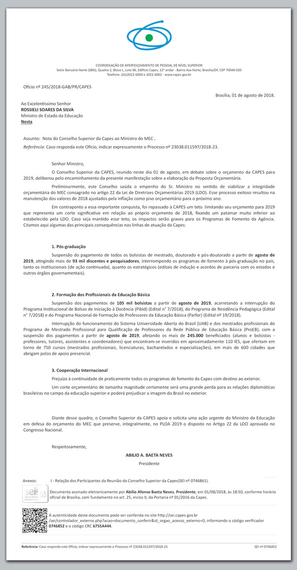 No dia 1º de agosto, o presidente da agência de fomento, Abilio Baeta Neves, enviou ofício ao ministro da Educação com um alerta sobre os impactos da redução orçamentária prevista para 2019