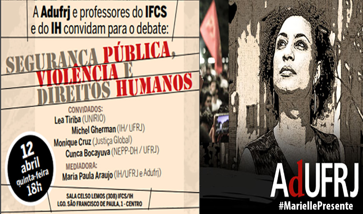 Evento faz parte de campanha de mobilização da associação docente pela apuração dos assassinatos da vereadora Marielle Franco (PSOL) e de seu motorista, Anderson Gomes A Adufrj realiza nesta quinta-feira, 12 de abril, o debate “Segurança pública, violência e direitos humanos”. O evento é promovido em parceria com professores do Instituto de Filosofia e Ciências Sociais e o Instituto de História. Transmissão será iniciada às 18h30. A atividade faz parte de uma campanha de mobilização da associação docente pela apuração dos assassinatos da vereadora Marielle Franco (PSOL) e de seu motorista, Anderson Gomes. Os crimes aconteceram em 14 de março, mas até agora ninguém foi punido. “Será uma discussão sobre as graves violações de direitos humanos em curso. O caso de Marielle é emblemático, mas não é isolado”, explicou a professora Maria Paula Nascimento Araujo, do Instituto de História e diretora da Adufrj. O debate está marcado para as 18h, na sala Celso Lemos (308), no Largo de São Francisco de Paula, nº 1, Centro. Na mesa, estarão Cunca Bocayuva, professor da UFRJ e coordenador da especialização (lato sensu) em Políticas Públicas e Cultura de Direitos do NEPP-DH; Lea Tiriba, educadora e ambientalista da Unirio; Michel Gherman, pesquisador do Núcleo de Estudos da Política da UFRRJ; e Monique Cruz, pesquisadora da ONG Justiça Global. “Nós convidamos tanto professores especialistas em direitos humanos quanto militantes da área, porque avaliamos que a universidade deve ser o espaço de troca de saberes”, complementou Maria Paula.