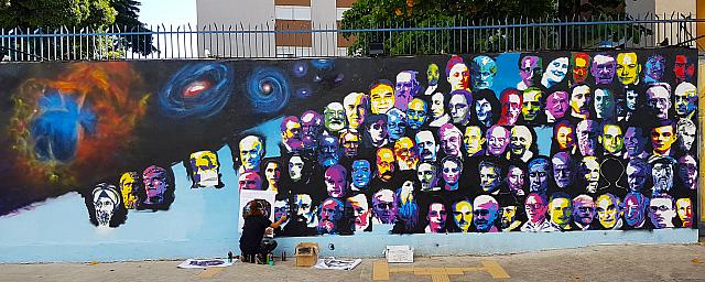 Dois painéis são de homenagem. “Construtores da ciência” faz uma releitura estilizada de 100 pesquisadores e inventores. A pintura com estêncil é uma clara referência ao quadro Operários de Tarsila do Amaral. Nele, o rosto de Stephen Hawking foi o último inserido. Já a pintura “A partícula que mudou o Brasil” destaca a detecção da partícula méson pi pelo pesquisador e fundador do CBPF, Cesar Lattes, uma das mais importantes descobertas da física no século 20.