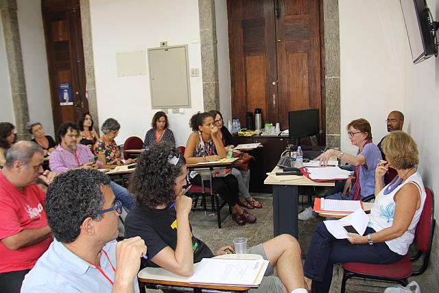 Reunião do Conselho de Representantes da associação docente, no Instituto de Economia, discutiu crime no contexto da intervenção militar no estado do Rio de Janeiro Os assassinatos da vereadora Marielle Franco e de Anderson Pedro Gomes na noite de quarta-feira modificaram a programação do Conselho de Representantes da Adufrj, na manhã de hoje (15), no Instituto de Economia. Os docentes relacionaram a ação violenta ao contexto da intervenção militar na segurança do Rio e decidiram criar um grupo de trabalho sobre o tema. A reunião também foi abreviada para que os professores pudessem participar da vigília em homenagem às vítimas, na Cinelândia. “O assassinato de uma vereadora é um fato completamente contrário à democracia”, disse a presidente da Adufrj, professora Maria Lúcia Werneck. Debates, aulas públicas, instalação de faixas em unidades e até mesmo uma assembleia geral para tratar da intervenção no estado foram cogitados no Conselho: “Nós temos de agir rápido”, afirmou o professor Fernando Santoro, do IFCS. “Não dá para uma associação docente não discutir essa questão, que é da maior gravidade”, reforçou Jorge Ricardo, professor da Faculdade de Educação. “Mas sempre com o cuidado de que o que pensamos aqui não é necessariamente o que a maioria dos professores pensa”, ponderou Leda Castilho, da Coppe. “Não podemos ficar falando só para nós. Devemos retomar as aulas públicas”, disse Romildo Bomfim, da Medicina. A diretoria da Adufrj vai divulgar em breve uma nota sobre os assassinatos e pretende organizar um debate a respeito da intervenção. Prestação de contas A prestação de contas da gestão anterior, entre 2015 e 2017, e uma prestação parcial das contas da atual diretoria, relativas a novembro e dezembro, foram aprovadas no Conselho de Representantes. Nova campanha A presidente da Adufrj, professora Maria Lúcia Werneck, anunciou que a entidade prepara uma campanha para apresentar à população os benefícios da UFRJ para o Rio de Janeiro. Segurança A diretoria vai se reunir, no próximo dia 20, com o prefeito universitário, Paulo Ripper. O objetivo é discutir os recentes casos de violência no Fundão. Novos GTs Além do GT sobre a intervenção, foi sugerida a criação de um grupo de trabalho para cuidar da relação da UFRJ com o ensino médio. Reuniões com as unidades Maria Lúcia Werneck afirmou que a diretoria está com a meta de fazer este ano pelo menos dez visitas às unidades da UFRJ para realizar discussões com os professores.