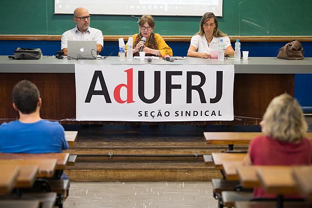 Defesa da universidade pública, democracia e soberania nacional. Estes são os eixos que vão guiar um movimento docente apartidário e não sindical, ainda em formação. A informação foi divulgada durante a Assembleia Geral da Adufrj do dia 4 pela presidente Maria Lúcia Werneck. “Nosso foco de atuação será o Congresso Nacional”, explicou a professora. A primeira reunião, que contou com representantes de seis associações docentes, ocorreu na sede da Adunb, em Brasília, no dia 1º. Com o objetivo de lançar um documento do grupo até março, início do período letivo para a maioria das universidades, outros encontros devem ser realizados nas próximas semanas. Maria Lúcia explica que o movimento surgiu em resposta à conjuntura de contrarreformas e outras medidas do governo que prejudicam o ensino superior público. As atividades do grupo serão mantidas pelo menos até as eleições de 2018, produzindo materiais para serem levados às candidaturas.