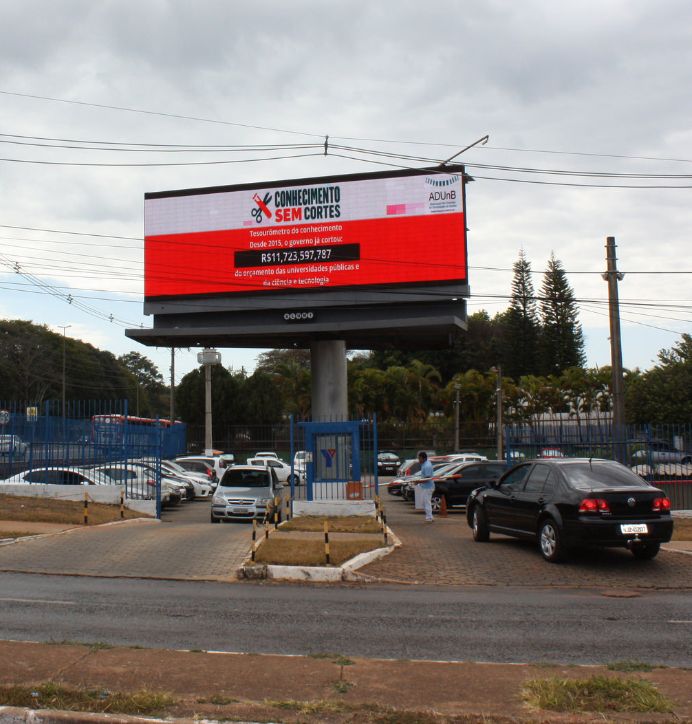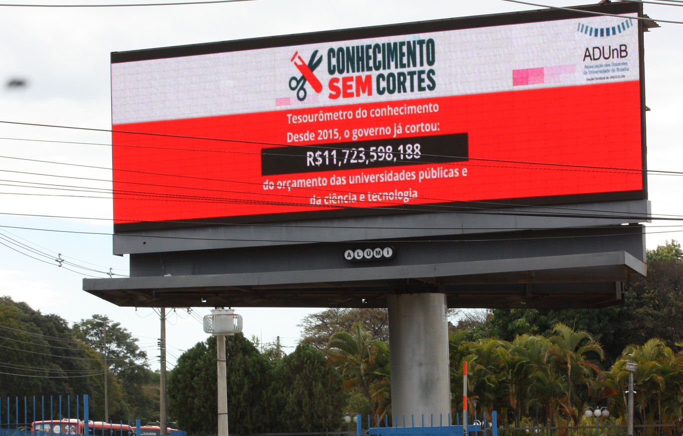A campanha Conhecimento Sem Cortes inaugurou dia 9, em Brasília, mais um tesourômetro. O painel eletrônico foi instalado numa via que liga o aeroporto ao Congresso. Bem à vista dos parlamentares A campanha Conhecimento Sem Cortes inaugurou na quarta-feira (9), em Brasília, um estratégico tesourômetro. O painel eletrônico que mostra, minuto a minuto, os cortes na Educação e na Ciência desde 2015, foi instalado numa via que liga o aeroporto ao Congresso. Bem à vista, portanto, dos parlamentares que vão votar o orçamento de 2018. Carlos Frederico Leão, professor do Instituto de Economia e vice-presidente da Adufrj, explicou, em um debate realizado na Universidade de Brasília, os cálculos que movem o tesourômetro: instituições federais de ensino superior, Capes e Ministério de Ciência, Tecnologia, Inovação e Comunicações estão perdendo cerca de R$ 500 mil por hora ou R$ 8 mil por minuto em comparação com o orçamento de 2015. A cifra já ultrapassou R$ 11 bilhões. Ele destacou que o governo tem o dinheiro para aplicar nestas áreas: “É uma questão de prioridade. Este mês, para não ser impedido, Temer destinou R$ 8 bilhões para o agronegócio”. Vírgilio Arraes, presidente da Associação dos Docentes da UnB — outra entidade envolvida na criação da campanha Conhecimento sem Cortes e seus tesourômetros —, destacou a iniciativa: “A ideia é materializar como é o impacto cotidiano nas universidades, a fim de envolver a sociedade e a população em geral.”, explicou. O painel do Distrito Federal é o terceiro: já existem outros na UFRJ e na UFMG. Ildeu Moreira, presidente da Sociedade Brasileira para o Progresso da Ciência, pontuou a importância do desenvolvimento científico para a soberania nacional. “A gente não tem projeto de nação, se não tiver projeto para Ciência e Tecnologia”, disse. Tamara Naiz, presidente da Associação Nacional de Pós Graduandos ( ANPG), tratou das consequências dos cortes para estudantes bolsistas. “Bolsa é mais que um direito; é uma necessidade num país que ainda convive com tanta desigualdade”, disse. Novos apoios O debate de inauguração do tesourômetro de Brasília contou com a presença de novas apoiadoras da campanha: a Academia Brasileira de Ciências e as entidades sindicais Andes e Proifes. Márcia Barbosa, membro titular da ABC, usou uma história familiar para criticar os cortes orçamentários. “Minha avó era pobre e sustentava os filhos com o trabalho de costureira. Em tempos de dificuldade, ela economizava muita coisa na casa, mas nunca vendeu sua máquina de costura. O Brasil está vendendo suas máquinas de costura.” Flavio Silva, vice-presidente do Proifes e professor de Goiás, falou dos impactos de cortes também na esfera estadual. “A Fapeg diminuiu em 90% os editais. Projetos aprovados em 2015 ainda não tiveram recursos liberados”. Epitácio Macário, 3º tesoureiro do Andes, elogiou o tesourômetro. “A ideia é muito bem vinda”. Macário observou, no entanto, que a comunidade científica também precisa abraçar outras campanhas. “Precisamos lutar contra a PEC do fim do mundo e contra as reformas previdenciária e trabalhista.”, finalizou. Representando a reitoria da UnB, o chefe de gabinete Paulo César pontuou que a mobilização precisa ir além do meio acadêmico. “Precisamos que a sociedade compreenda o atraso que essa política (de contingenciamento) representa”.