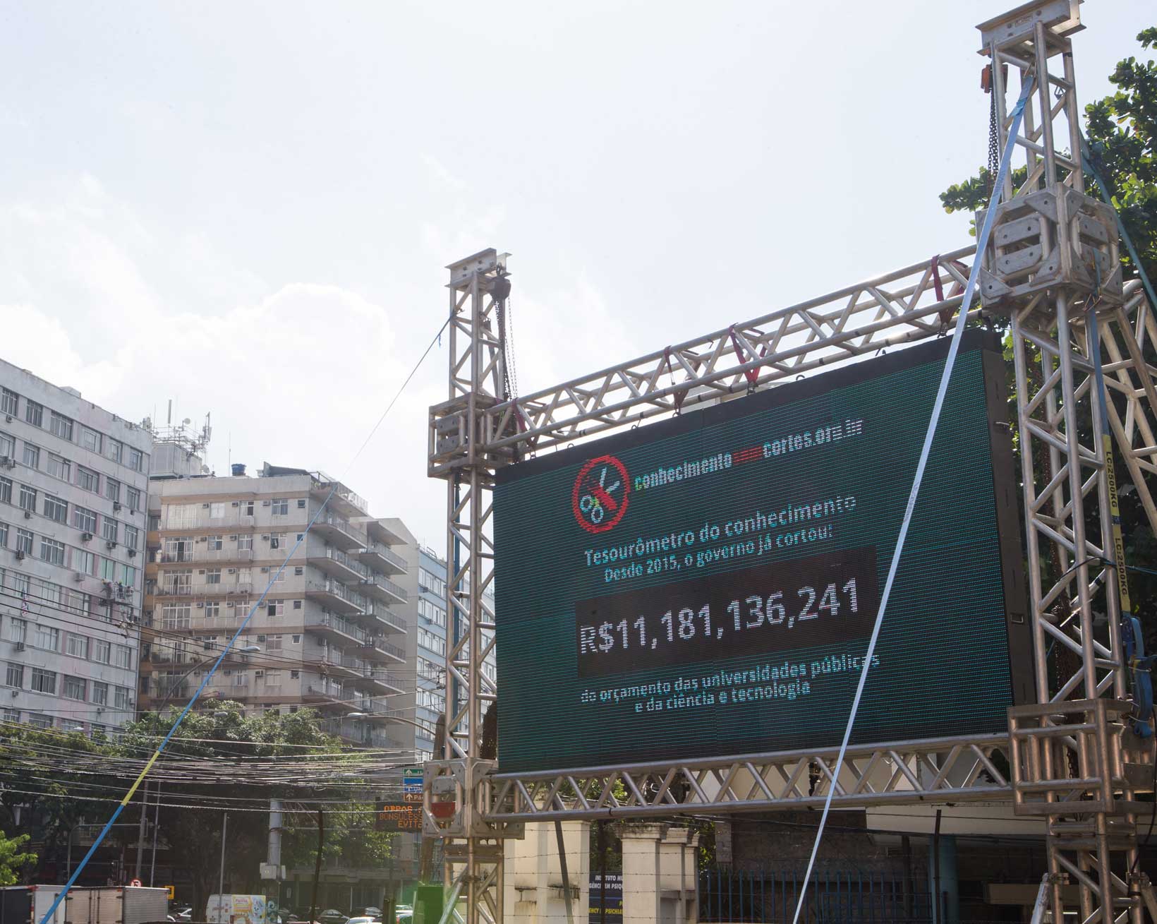 Instrumento da Campanha Conhecimento Sem Cortes, o painel em LED que registra em tempo real as perdas orçamentárias da Educação e da Ciência será inaugurado no campus da UFMG, durante a 69ª Reunião Anual da SBPC A Campanha Conhecimento sem Cortes vai ganhar o reforço de mais um "tesourômetro", em Belo Horizonte (MG), na próxima semana. O novo contador digital da redução de orçamento da Educação e da Ciência será inaugurado no campus da Universidade Federal de Minas Gerais, no dia 18. O painel mostra perdas de R$ 500 mil por hora no setor, desde 2015. A cifra total já ultrapassa os R$ 11,4 bilhões. A UFMG não foi escolhida à toa para a instalação da segunda unidade do "tesourômetro". O Sindicato dos Professores de Universidades Federais de Belo Horizonte, Montes Claros e Ouro Branco (Apubh) é uma das entidades parceiras da Adufrj na criação da campanha. Além disso, aquela universidade vai receber, a partir do dia 16, a 69ª Reunião Anual da Sociedade Brasileira para o Progresso da Ciência — o maior evento científico da América Latina. A SBPC abriu espaço na sua programação para um debate sobre os cortes, com o tema "As universidades e os professores diante da crise brasileira", no dia 18, às 13h, com a presença da presidente da Adufrj, Tatiana Roque. Em seguida, haverá a apresentação do novo “tesourômetro”. A companha #ConhecimentoSemCortes nasceu da necessidade de alertar a sociedade para os problemas financeiros pelos quais passam as instituições de ensino superior e pesquisa por conta da falta de recursos. “Se os cortes atuais não forem suspensos, corremos o risco de que pesquisas de enorme relevância para a sociedade brasileira sejam interrompidas”, afirma Tatiana Roque, presidente da Adufrj. “Algumas Nações mostraram ao longo do tempo que investir continuamente em educação, saúde, ciência e tecnologia é uma opção viável e segura para vencer as dificuldades”, reforça Carlos Barreira Martinez, presidente da Apubh. A exposição do problema em números começou no dia 22 de junho, quando foi lançado o primeiro “tesourômetro” no campus da UFRJ da Praia Vermelha. Além disso, os docentes da UFRJ colocaram no ar um site com os dados detalhados dos cortes – www.conhecimentosemcortes.com.br – e iniciaram uma petição online. O objetivo é reunir 20 mil assinaturas pela retomada dos investimentos nas universidades no patamar registrado em 2014, assegurar a continuidade do pagamento das bolsas de estudo e permanência. Também é exigida a retirada da Educação e da Saúde do teto de gastos fixado por meio da Emenda Constitucional 95, aprovada em 2016. Próxima escala: Brasília Está nos planos da campanha instalar uma terceira unidade do “Tesourômetro” em Brasília, uma vez que o sindicato de professores da UnB também está envolvido na iniciativa. Desta forma, os organizadores pretendem aumentar a pressão sobre os parlamentares federais quanto à necessidade de preservar os recursos que alimentam a pesquisa e o desenvolvimento brasileiros. Isso ocorreria justamente no momento em que o Congresso Nacional inicia o debate sobre a Lei Orçamentária para 2018. Cálculo do tesourômetroO professor e economista Carlos Frederico Leão Rocha, vice-presidente da Adufrj, explica como é calculado o número exposto no “tesourômetro”. São consideradas as verbas do Ministério da Ciência, Tecnologia e Inovação (MCTI), da Coordenação de Aperfeiçoamento de Pessoal de Nível Superior (Capes) e das universidades federais. Na Lei Orçamentária de 2015, estes setores deveriam receber R$ 26,7 bilhões. Em 2016, o valor era de R$ 17,5 bilhões. Em 2017, já contabilizando os contingenciamentos anunciados pelo governo, o orçamento previsto caiu para R$ 13,3 bilhões. As diferenças do ano atual e do ano passado em relação a 2015 foram aplicadas ao intervalo de tempo para fazer girar o contador eletrônico: “Em apenas dois anos, perdemos 50% dos valores de custeio e investimento”, afirma o diretor da Adufrj.