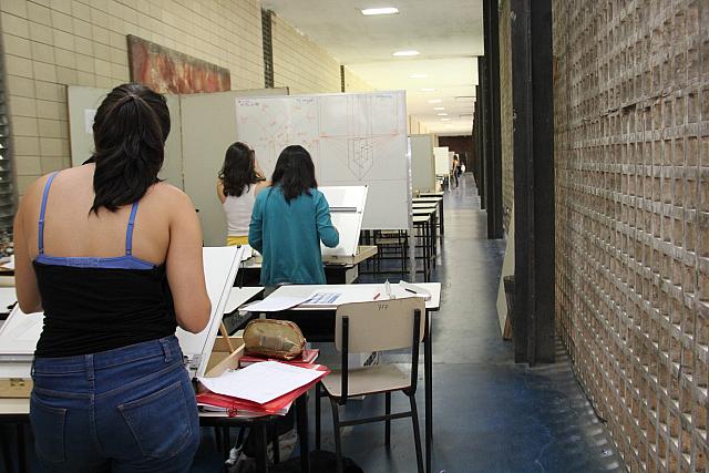 Dalton está dando aula de Geometria e perspectiva em uma das seis baias divididas por divisórias no acesso ao Salão Azul. “Voltamos há apenas uma semana e já estou rouco. Não há qualquer acústica”. Ele afirma que não sabe como serão as 10 semanas que faltam para completar o semestre. “Sempre tivemos problemas com a manutenção (da estrutura) e condições (de trabalho), mas nunca foi tão ruim. Para dar esta aula, eu precisaria de um quadro ao menos quatro vezes maior”, desabafa.