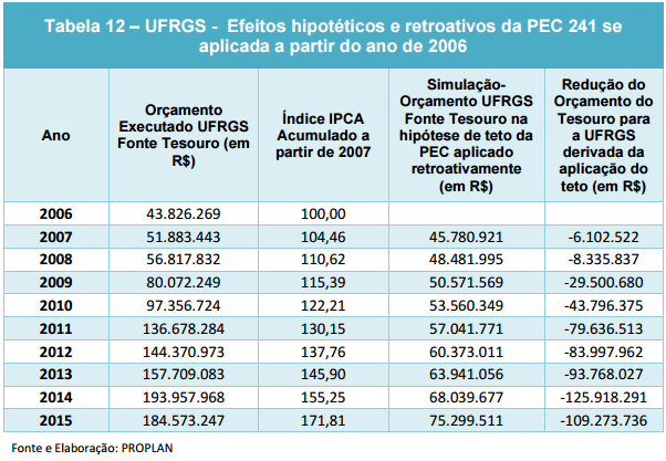 A reitoria da Universidade Federal do Rio Grande do Sul divulgou, na última sexta-feira (4), um estudo de impacto financeiro da Proposta de Emenda Constitucional que limita os gastos públicos. O documento aponta que a PEC 241, aprovada na Câmara e em tramitação no Senado (como PEC 55), “tende a criar problemas substanciais de financiamento para custeio e capital”. De 2006 a 2015, se a PEC já estivesse em vigor, a UFRGS teria perdido R$ 580,3 milhões em relação ao orçamento executado, no período.
