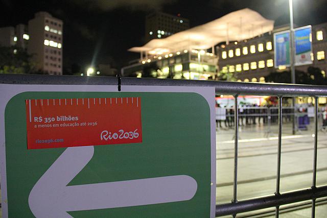 Sob forte vigilância policial, cerca de 60 pessoas denunciaram os impactos da PEC 241 que congela gastos sociais por 20 anos. Com faixas e panfletos feitos especialmente para o período dos Jogos, eles dialogaram com a população sobre prioridades de investimentos públicos.