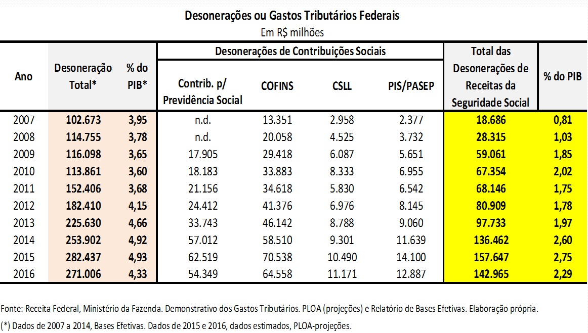 Desonerações fiscais têm sido marca crescente dos últimos governos (tanto na esfera federal, quanto na estadual e municipal). No âmbito federal, são realizadas também sobre recursos que deveriam compor a receita da Previdência Social e o financiamento de todo o sistema de Seguridade Social — que inclui a Saúde, a Previdência e a Assistência Social. Em 2015, a União abriu mão de aproximadamente R$ 62,5 bilhões que seriam destinados à Previdência. Somadas todas as desonerações que compõem o orçamento da Seguridade, o montante chegou a R$ 157,64 bilhões e equivaleu a 2,75% do PIB no ano passado. Os dados foram apresentados por Denise Gentil, economista e professora da UFRJ, especialista em finanças públicas. A palestra foi realizada no dia 5, organizada pelo Núcleo da UFRJ pela Auditoria Cidadã da Dívida Pública.
