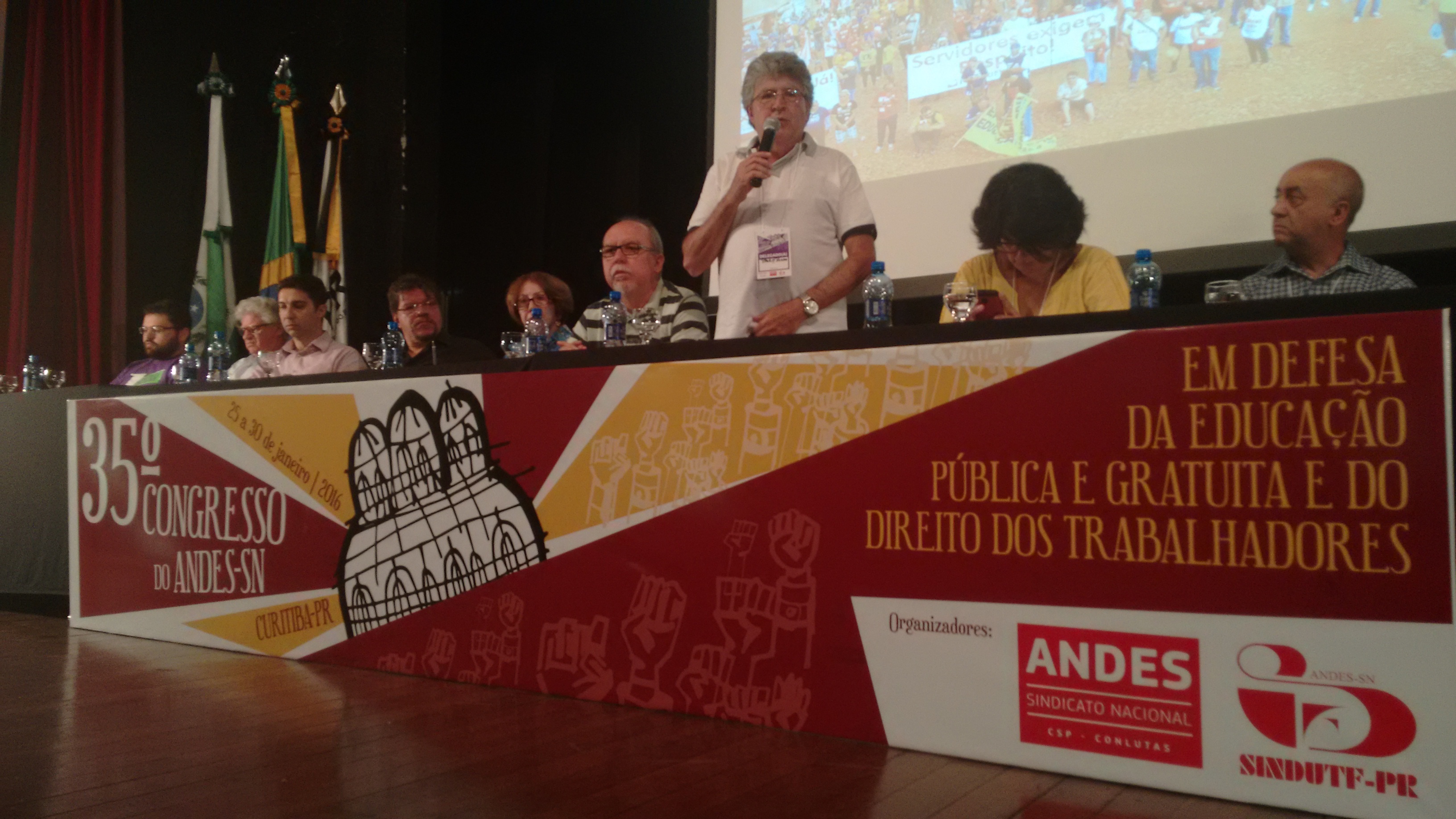 O 35º Congresso do Andes-SN teve início nesta segunda-feira (25/01), em Curitiba (PR). Presidente do Sindicato Nacional, Paulo Rizzo destacou, na mesa de abertura do evento, a conjuntura adversa para 2016: "Não apenas pela agenda conservadora que vemos no Congresso Nacional, mas também pela troca ministerial que aponta contrarreformas na Previdência e trabalhista”, disse.