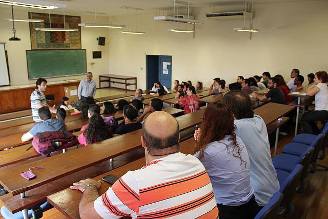Mais de sessenta pessoas participaram de uma reunião nesta quarta-feira, 2, no Instituto de Química (IQ), para discutir a falta de pagamentos dos salários dos funcionários terceirizados da limpeza, contratados via empresa Venturelli. Professores, alunos e terceirizados compareceram.