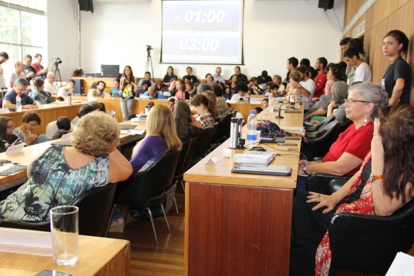 Professora Eleonora Ziller apresenta relatório sobre o IPUFRJ ao Consuni. Foto: Silvana SáEstudantes do Instituto Politécnico de Cabo Frio ocuparam a sessão do Consuni, dia 26, para acompanhar a apresentação de um relatório da professora Eleonora Ziller (representante dos Adjuntos do CLA) sobre a origem e constituição do IPUFRJ. A expectativa era que se pudesse discutir e deliberar sobre o assunto na sessão. Mas, com o longo tempo destinado a informes e, posteriormente, à discussão e indicação de nomes para compor os conselhos da Fundação José Bonifácio (leia mais em Consuni indica novos conselheiros para a FUJB), houve um prazo exíguo para este ponto da pauta. Logo após a fala da professora, a sessão foi encerrada.