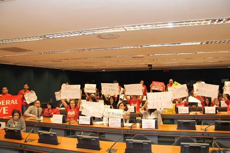 Os docentes do CNG lotaram a sala do Plenário 12, onde ocorreu a audiência, e durante todas as falas exibiram cartazes contrários a aprovação da PEC 395/14 e cobrando a abertura de negociação com o ministro da Educação, Renato Janine, que desde o início da greve, que completa 90 dias na próxima semana, ainda não recebeu os docentes.