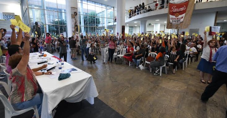 Os professores da UFRJ, reunidos em Assembleia Geral convocada pela Adufrj-SSind, no dia 12, aprovaram a continuidade da greve. Um longo debate sobre a atual conjuntura, os cortes do orçamento e o momento da greve antecedeu a votação.