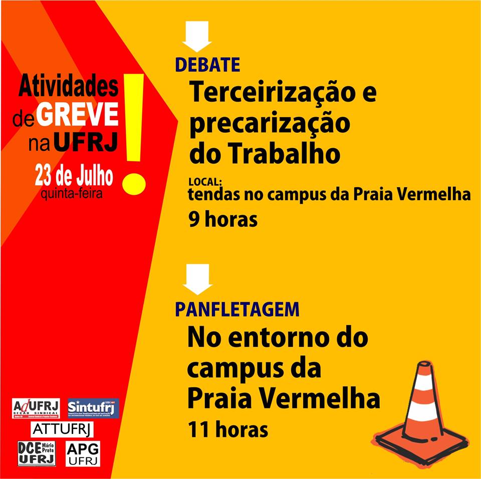 Organizada pelos segmentos em greve da instituição, a “UFRJ na Praça contra os cortes no orçamento” deixou a Cinelândia mais colorida. Escola de Educação Infantil, Instituto de História, Instituto de Nutrição, Colégio de Aplicação, NEPP-DH, EBA, EEFD, ECO, ESS, Escola Politécnica, Faculdade de Educação, FACC, Faculdade de Letras e FND marcaram presença e envolveram-se na organização de aulas públicas, oficinas, exibição de filmes seguida de debates, leitura de poemas, entre outras tantas atividades.