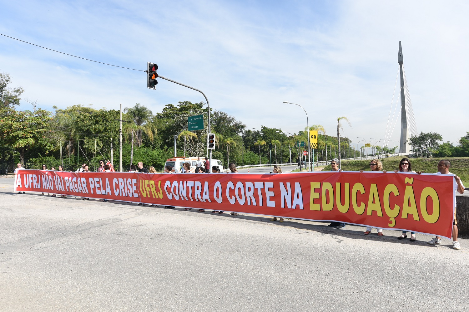 Um ato simbólico marcou na tarde de quarta-feira, 15 de julho, a greve contra os cortes na educação na UFRJ. Professores, técnicos e estudantes transformaram a fixação de faixa na lateral da Ponte do Saber, sobre a Linha Vermelha, em mais uma manifestação de denúncia dos ataques que colocam a universidade pública como alvo. “Ufrj contra o corte na educação” é o conteúdo da faixa exposta aos motoristas que se dirigem ao Centro.