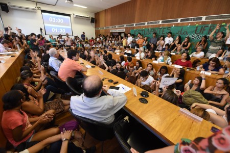 Alguns representantes docentes clamaram pela unidade da comunidade universitária contra “a polarização dos segmentos”, em favor de uma “UFRJ unida” para enfrentar as adversidades. Segen Estefen, por exemplo, disse estar preocupado com o aprofundamento da divisão entre professores, técnicos e estudantes e se declarou favorável a um movimento único “em defesa da universidade”. Já a estudante Caroline Borges, entre outros, enfatizou que a mudança do perfil socioeconômico da universidade a partir da implantação das cotas expõe conflitos já presentes na sociedade: “Fala-se de muito da excelência da universidade, mas a verdade é que somos nós bolsistas e cotistas que fazemos a ponte com a sociedade real. Tratar desiguais como iguais não é democrático. A suspensão do calendário é uma oportunidade de a universidade se preparar para receber adequadamente os três mil cotistas que estão para entrar”.