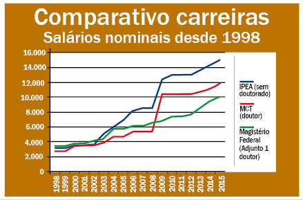 Em 1998, um professor, nessas condições, recebia um pouco mais que os colegas das outras carreiras: R$ 3.388,31, contra R$ 3.128,25 do pesquisador do IPEA e R$ 2.662,36 do pesquisador do MCT. Essa situação perdurou até 2003, quando os quadros do IPEA passaram a receber mais. Em 2009, os docentes federais foram ultrapassados também pelos pesquisadores do MCT. Desde então, apesar de apresentarem uma ligeira aproximação com os servidores do ministério de Ciência e Tecnologia, os professores continuaram desprestigiados.