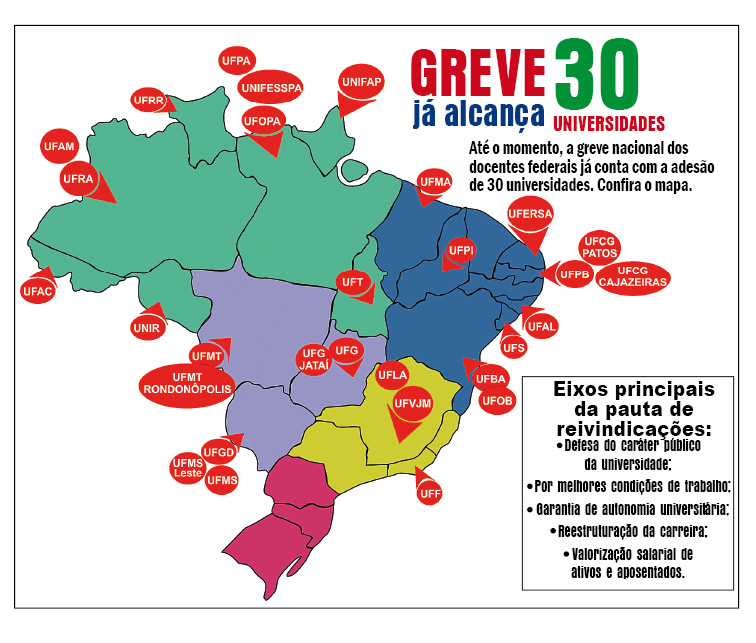 A pauta de reivindicações da categoria traz, entre seus eixos, a defesa do caráter público da universidade, condições de trabalho, garantia da autonomia, a reestruturação da carreira docente e a valorização salarial de ativos e aposentados.