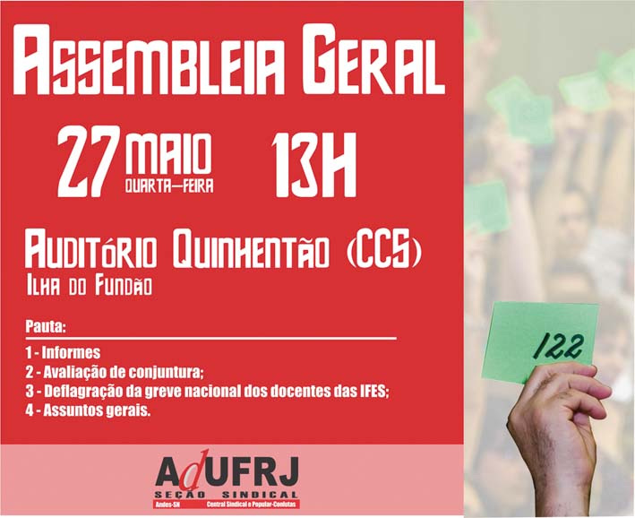 O encaminhamento foi aprovado pela ampla maioria das 43 seções sindicais do Andes-SN nas IFE presentes à reunião de Brasília: “Chamamos os professores em todo o país a participarem das assembleias que serão realizadas para tratar da deflagração da greve. A hora é agora, as universidades e demais instituições federais de ensino estão à míngua, sem condições de funcionamento, enquanto o governo anuncia que vai promover mais cortes”, conclamou o presidente do Andes-SN, Paulo Rizzo, em referência ao discurso do ajuste fiscal. A Assembleia Geral da Adufrj-SSind está marcada para 27 de maio (veja quadro nesta página).