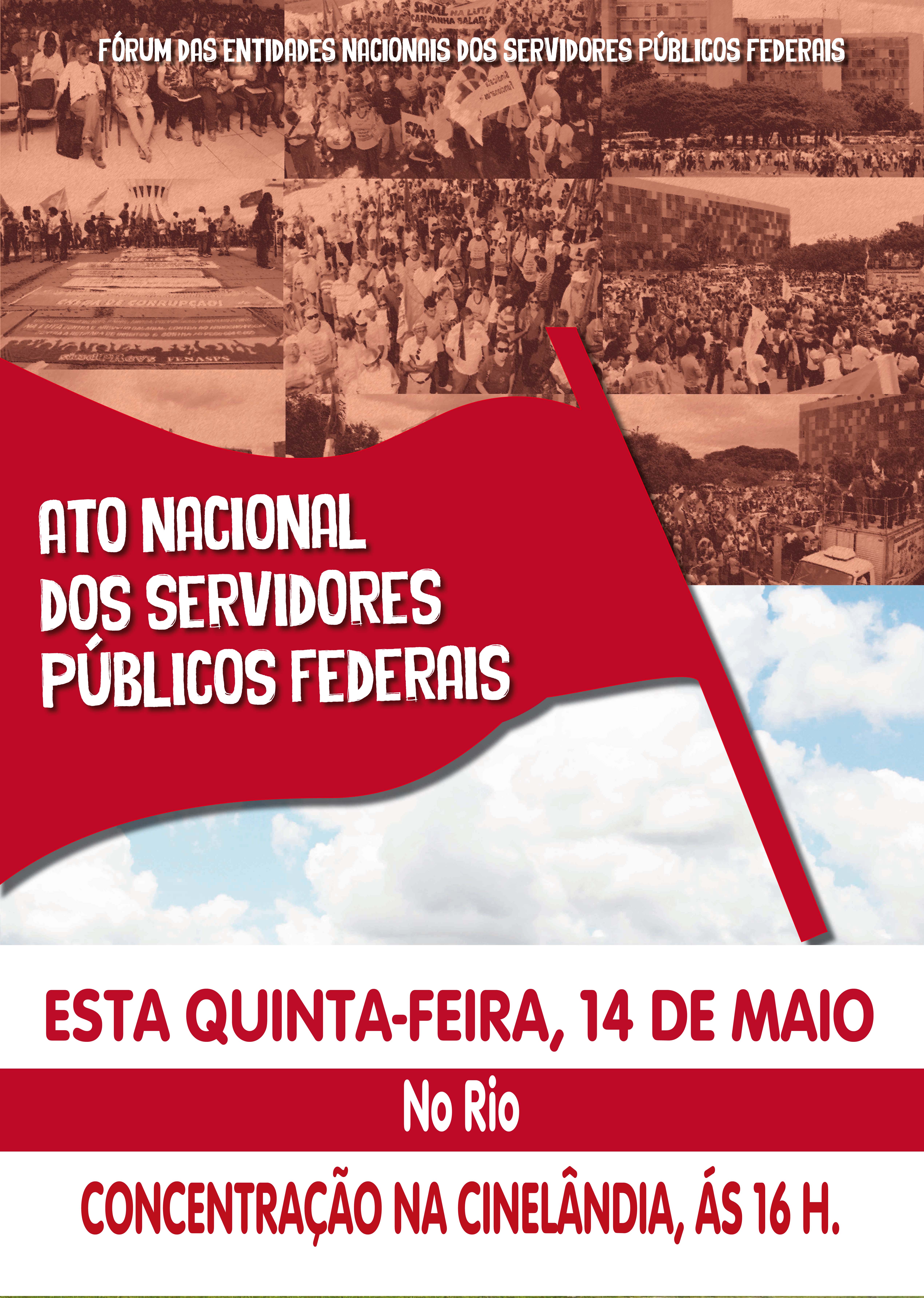 O Dia Nacional de Paralisação dos servidores públicos federais (SPF) acontece nesta quinta-feira, 14 de maio. Em Brasília, a manifestação de servidores de todo o país será em frente ao Ministério do Planejamento (Mpog), às 10h da manhã. No Rio, os servidores federais vão ocupar a Cinelândia a partir das 16h.