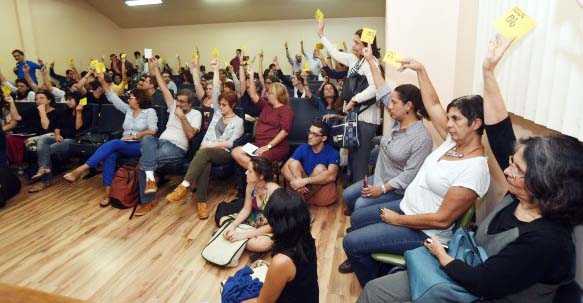 O auditório da Escola de Serviço Social da UFRJ lotado de professores foi o cenário para a aprovação do indicativo de greve, ainda sem data, dos docentes da UFRJ. A deliberação foi levada ao Andes-SN, em Brasília, neste fim de semana, para o debate com a rede nacional de seções sindicais do setor das Instituições Federais de Ensino Superior (Ifes), que também decidiram sobre o assunto em suas assembleias.