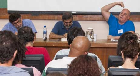 Rogério Lustosa (à esq.), Mauro Iasi e Luiz Edmundo Motta compuseram a mesa do debate. Foto: Marco Fernandes - 31/03/2015