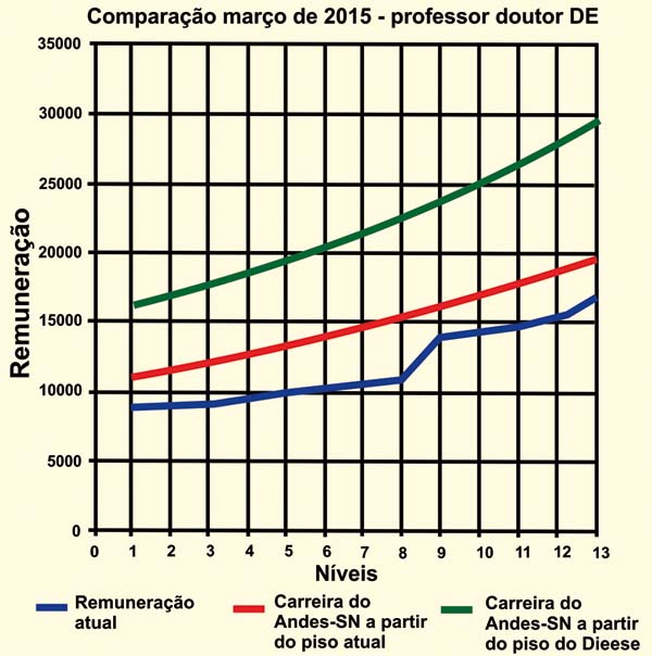 Mas, como se sabe, esse é apenas um dos problemas da atual carreira: os referenciais remuneratórios aparecem em tabelas de valores nominais, sem piso, sem relação, nem lógica de evolução entre classes e níveis e entre regimes de trabalho e titulações. Como demonstra a tabela ao lado. (Fonte: Informandes especial de março. Edição: Adufrj-SSind)